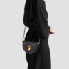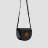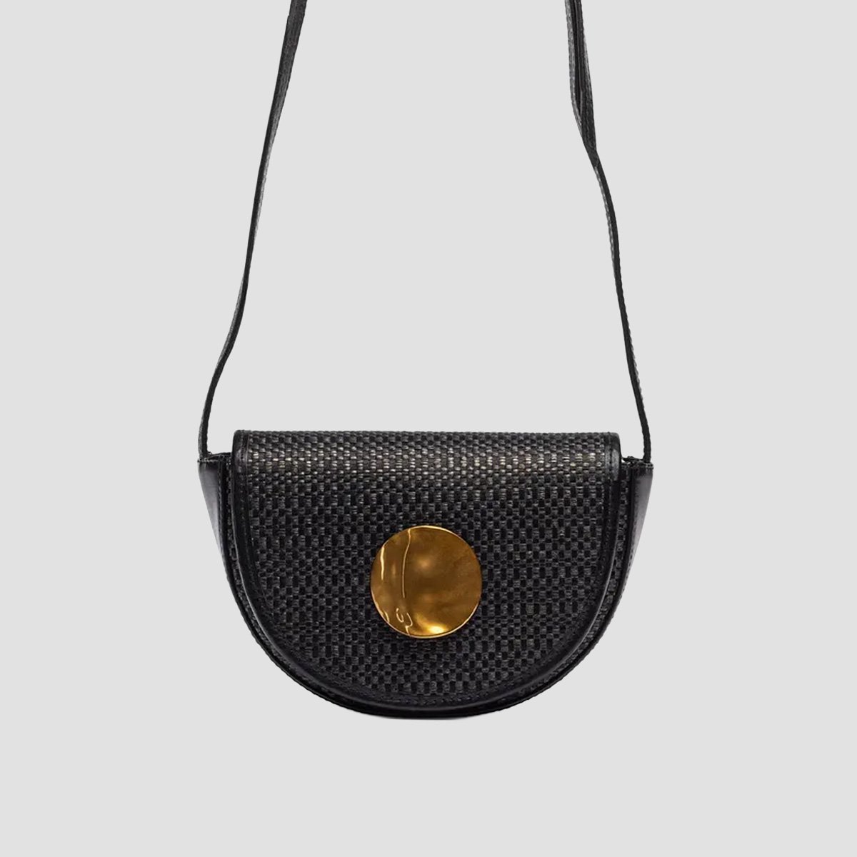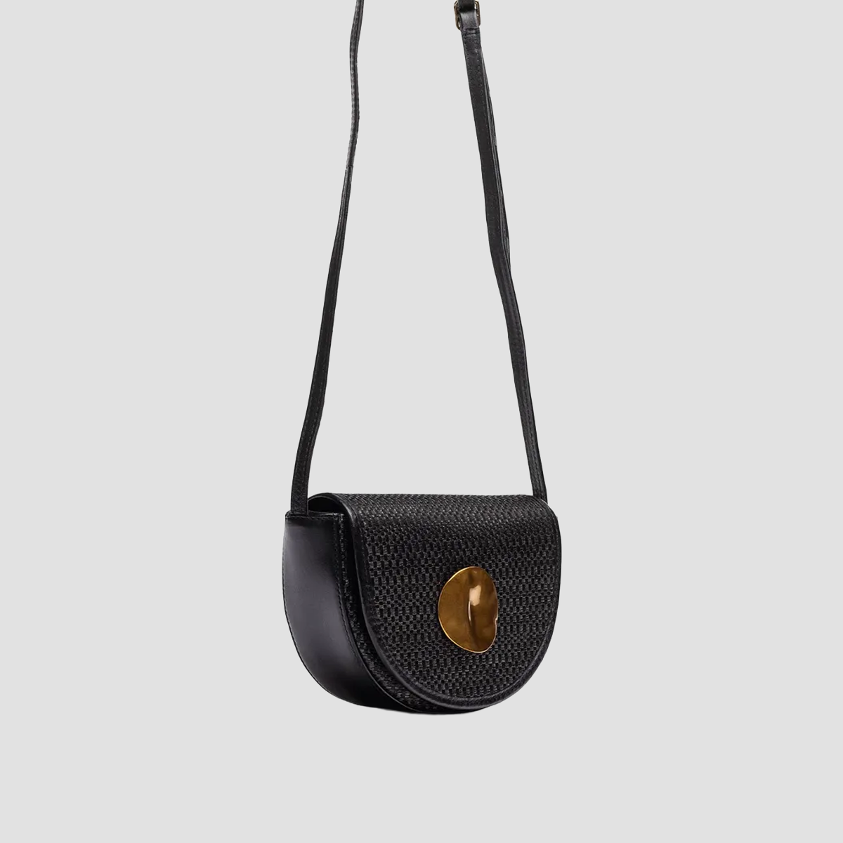 Small handbag made from natural raffia with a magnetic snap closure and a pocket inside. Suede crossbody strap in a matching tone inside with a decorative metal trim on the flap.