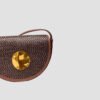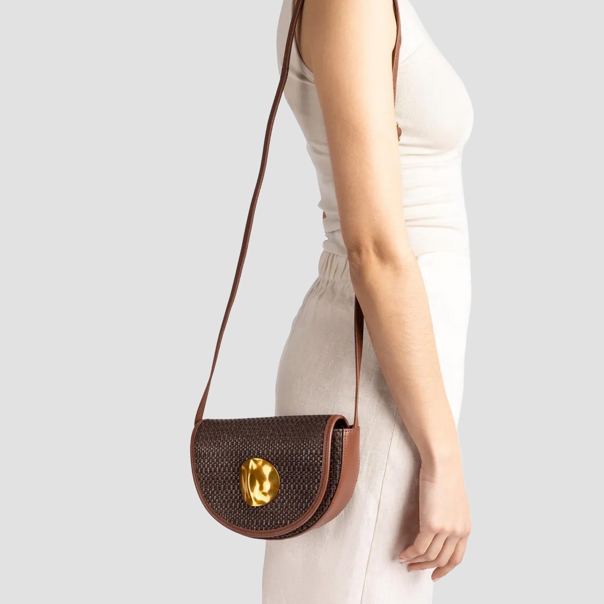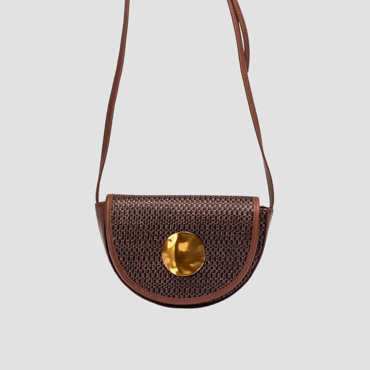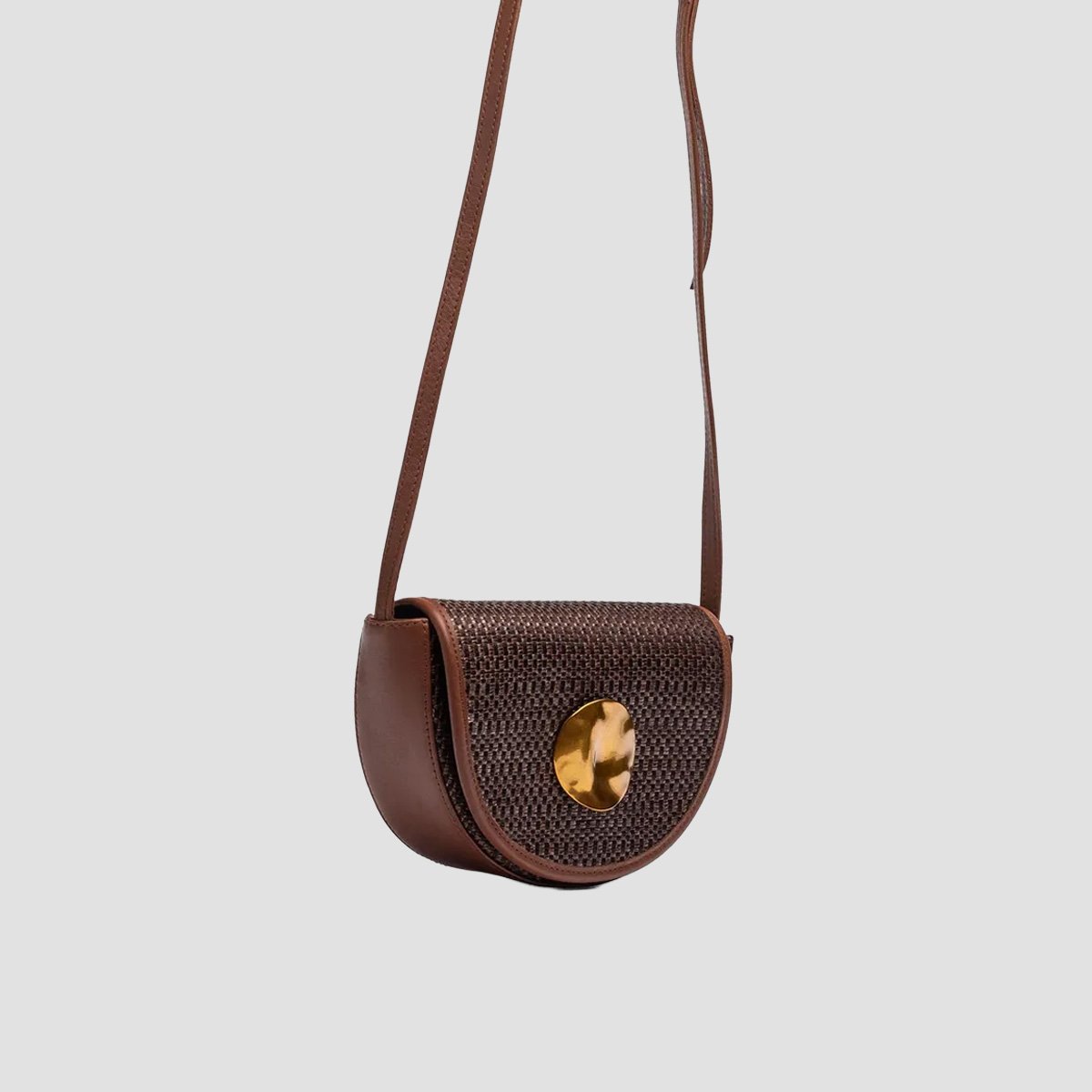 Small handbag made from natural raffia with a magnetic snap closure and a pocket inside. Suede crossbody strap in a matching tone inside with a decorative metal trim on the flap.